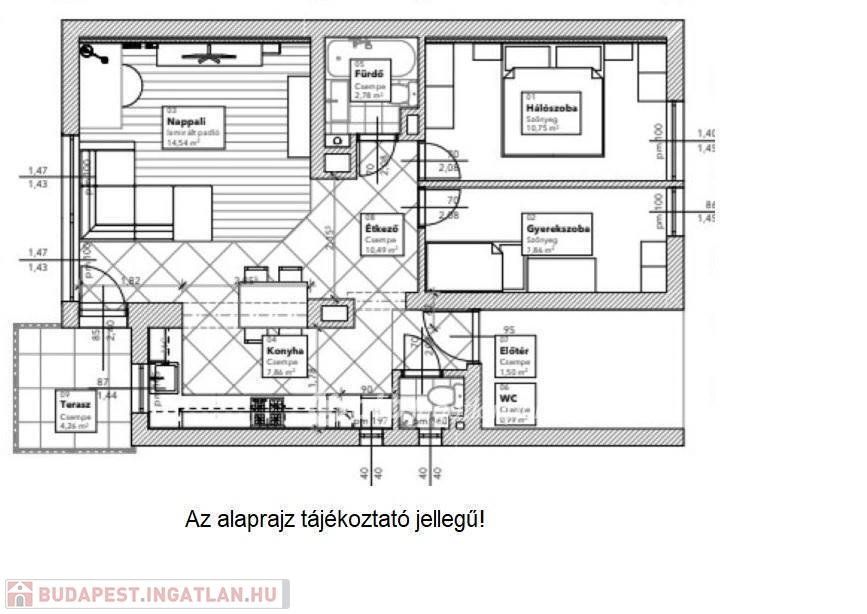 Az elrendezése nagyon jó, nappali, 2 hálószoba, étkező-konyha, egy kádas fürdőszoba és egy külön wc található benne.