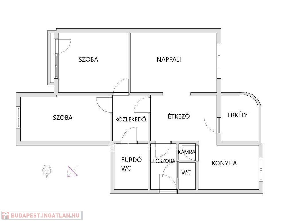 Az ingatlan jelenleg nappali+konyha+spajz+étkező+gardróbszoba+2 hálószoba+ wc-s fürdőszoba+1 wc elrendezésű.
