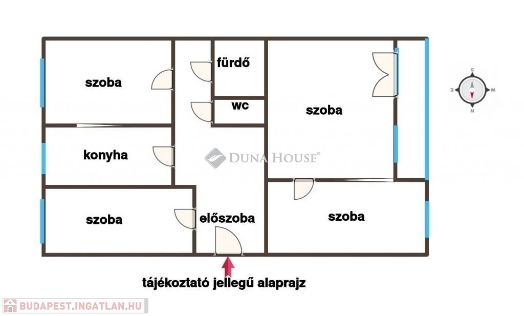 Tájolás: K és NY, Két szoba és a konyha ablakai keletre, míg a másik két szoba és az erkély ablakai nyugatra néznek.
