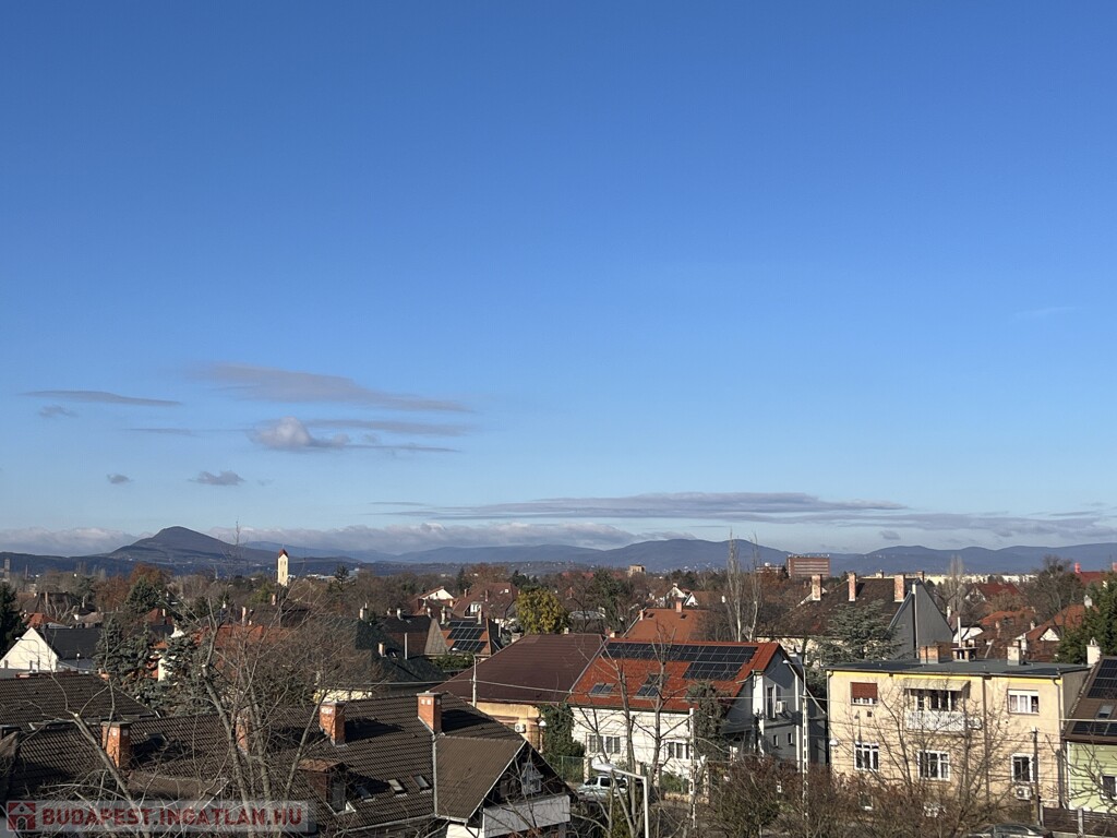 Az 55 m²-es terasz az év nagy részében túlzás nélkül valódi élettérként működik. Viszonylag intim, az utcáról nem látni fel rá, a szomszéd házak kellő távolságban vannak. A délelőtti nap a konyha felőli oldalra süt, a délutáni a szobák elé — évszaktól függően jól variálható a terasz használata. A kilátás igazán szép, a szobák felöli oldalon a kertvárosra és a Budai hegyekre látunk rá meglepően messzire. A kedvencünk pedig a terasz előtti nagy fa, aminek a lobkoronáját látjuk a szobákból is. Tettem fel a teraszról képeket a tavaszi időszakból is, az aktuális képek mellett.