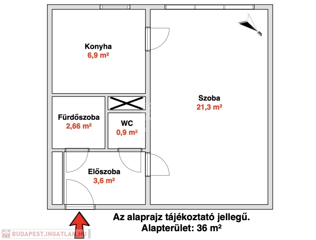 Az előszobából külön nyílik a fürdőszoba és a WC, itt kapott helyet egy beépített gardróbszekrény is. A tágas, padlószőnyeggel burkolt szobából nyílik a konyha, amely ablakos, konyhabútorral felszerelt.