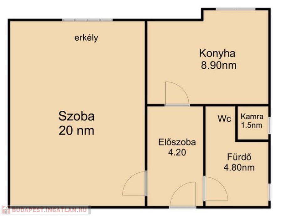 Ahogy belépünk a lakásba, egy tágas előszobába érkezünk, innen balra található a világos szoba, amely dupla rétegű fa nyílászárókkal, redőnnyel felszerelt, és egy hangulatos franciaerkély is kapcsolódik hozzá. Szemben helyezkedik el a fürdőszoba WC-vel , zuhanyzóval, míg jobbra fordulva jutunk el a konyhába, ahol szintén fa nyílászáró található. A konyhából nyílik a praktikus kamra. A lakáshoz tartozik még egy 6 nm-es saját pince, valamint egy 1 autó számára alkalmas garázs is.