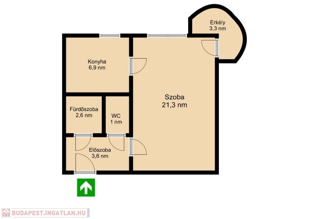 Rendezett, tiszta lépcsőházból a több ponton záródó biztonsági záras bejárati ajtón keresztül lehet bejutni. Egy nagyon tágas 3,6 nm-es előszobába ahol balra egy teljes falat elfoglaló gardrób szekrény teszi lehetővé a bőséges tárolást. Szemben találjuk 2,6 nm-es kádas fürdőszobát. Mellette a külön helységben nyíló 1 nm-es toalettet. Jobbra továbbhaladva tárul elénk a tágas 21,3 nm-es világos, klímával felszerelt nappali ahonnan a 3,3 nm-es egyediséget sugalló félkör alakú fedett erkélyre léphetünk ki. Itt reggelente a friss levegőn kávézhatunk és gyönyörködhetünk az elénk táruló panorámában. A szobából balra a 6,9 nm-es étkező sarkos, ablakos, bútorozott, tágas konyhában találjuk magunkat ahol kényelmesen lehet főzni, étkezni.