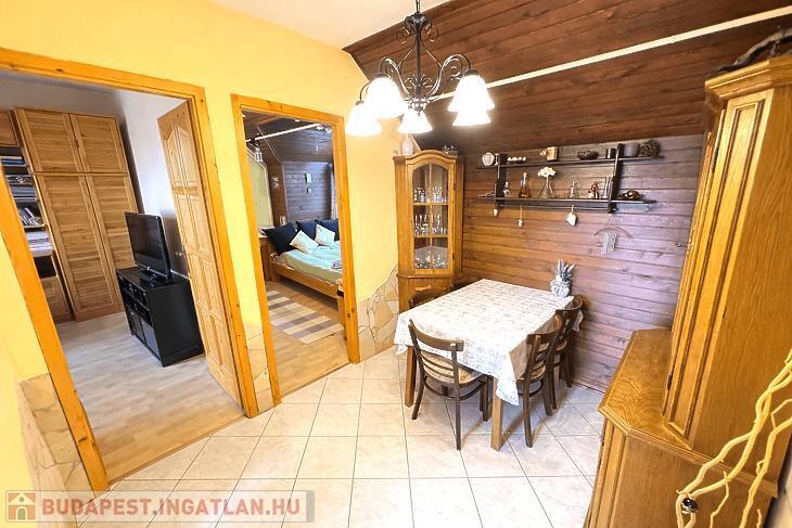 Elosztása: 1 szoba + 1 félszoba, külön étkezővel, praktikus kialakítással. A szobák laminált parkettával burkoltak, míg a konyha és az étkező járólappal ellátott. A lakás meleg, fa burkolatokkal és fa beltéri ajtókkal rendelkezik, jó állapotú, folyamatosan karbantartott, azonnal költözhető.