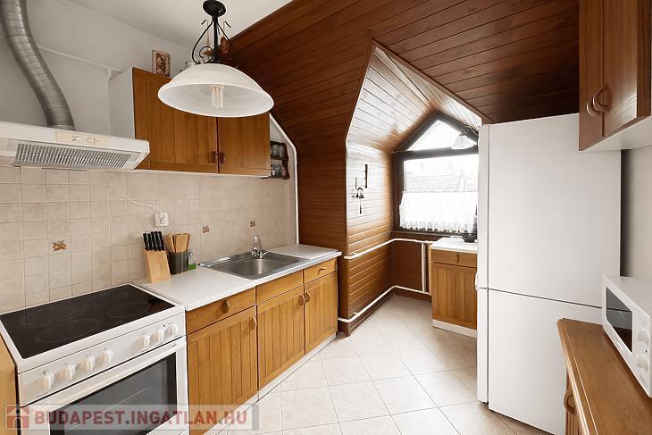 A tetőtéri kialakításnak köszönhetően hangulatos, világos terek jellemzik. A konyha és a szobák is természetes fényt kapnak, barátságos, otthonos érzetet biztosítva.