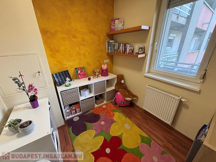 A zárt elektromos kapun keresztül, igényes, kertész által karbantartott, közös kertbe juthatunk, ahol játszótóteret, illetve sok iskola utáni programot lehet igénybe venni gyermekek számára (Megyeri Klub). Szintén itt a zárt területen, két autó számára, ingyenesen biztosított a parkolás! A beépített bútorzat a vételár részét képezi.