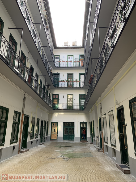 Eladó Budapest egyik legismertebb sétálóutcájában, a Ráday utca elején, egy tulajdoni lap szerint 47 m²-es, valóságban azonban 100 m² hasznos területű ingatlan, amely két teljesen külön bejáratú, belső kétszintes lakásból áll.