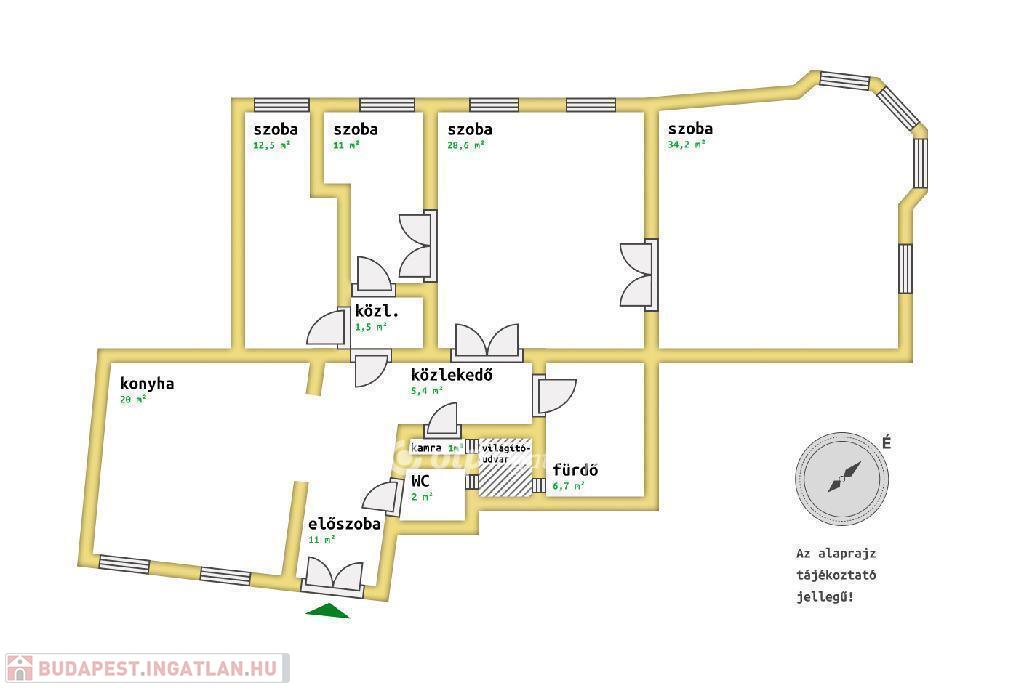A lakásban egy 20 nm-es étkezős konyha, három nagy méretű szoba (28,6 és 34,2 nm-es főhelyiségekkel), egy további kisebb szoba, külön fürdő, WC és kamra található.