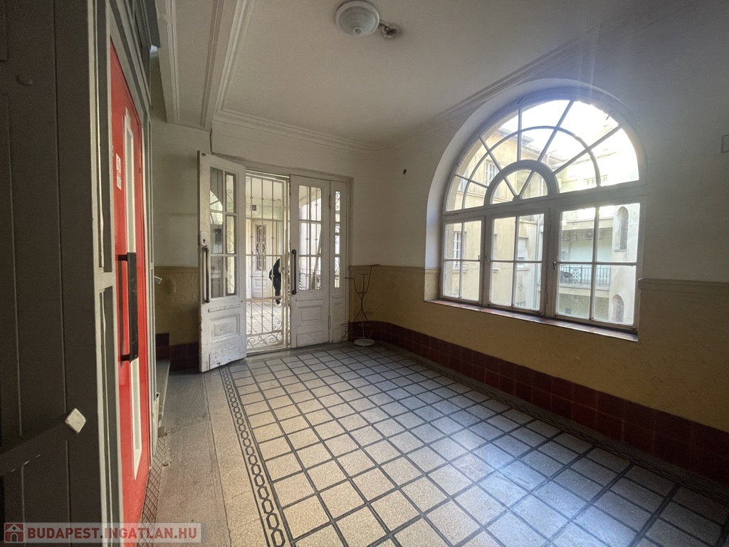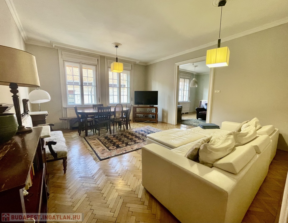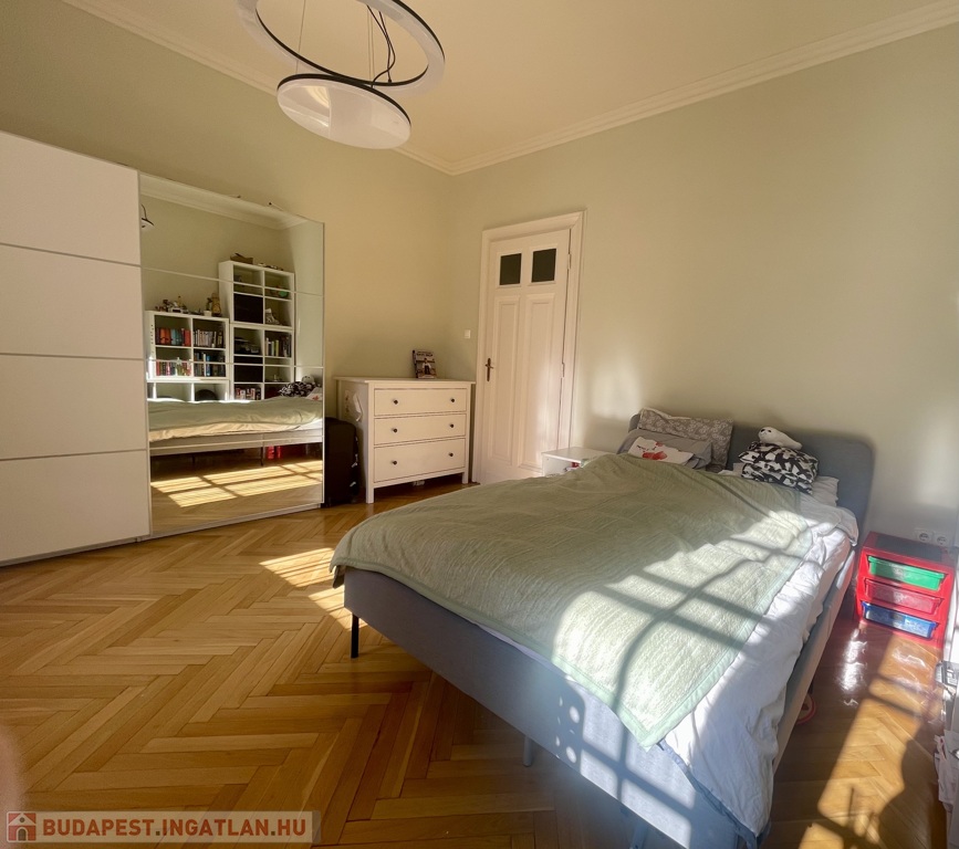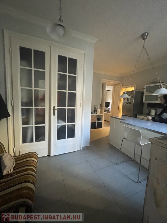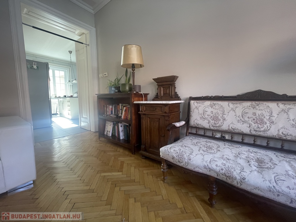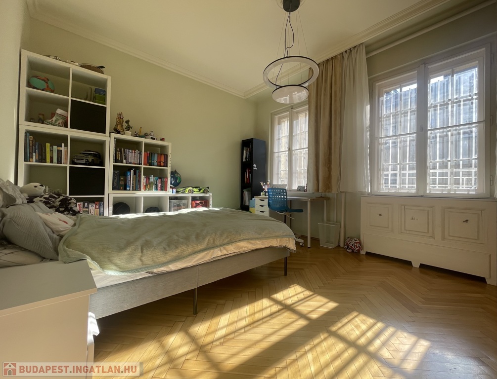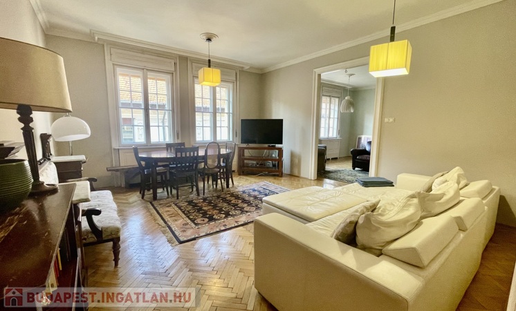 In Kinizsi Street, 9th district of Budapest (on the corner of Ráday Street), a 99 m2, 2-bedroom, well-proportioned, upper-middle-class apartment is FOR SALE ina good condition. (Living room 28.5m2, large bedroom 26.5m2, small bedroom 16.5m2). The property is on the 5th floor in an old apartment building, facing the street. The apartment has walk-around, bright, spacious spaces, cassette windows, original old interior doors and original parquet. The property underwent a complete mechanical and aesthetic renovation ten years ago, during this time it was transformed into a youthful, modern and fully mechanized home that meets today's needs. A storage room was created next to the hallway and kitchen, where the shoe cabinet, boiler and washing machine are located behind a nice cassette door.