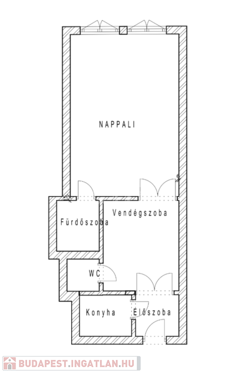 előszoba, hall, melyből egy szoba nyílik, étkező, konyha, fürdőszoba, vendég-WC.