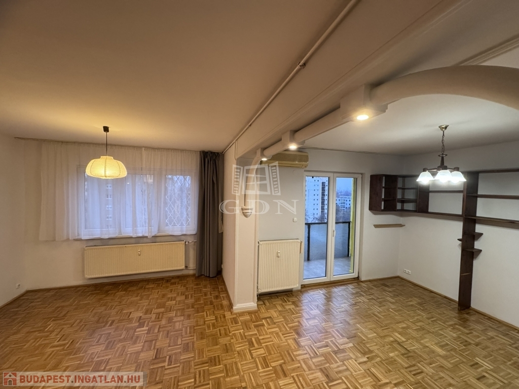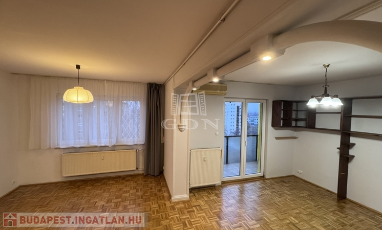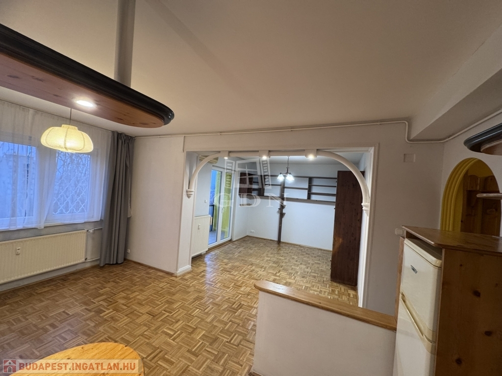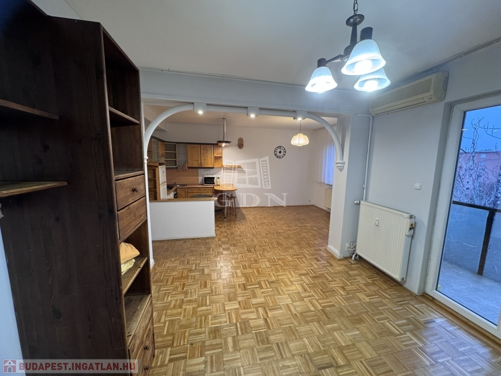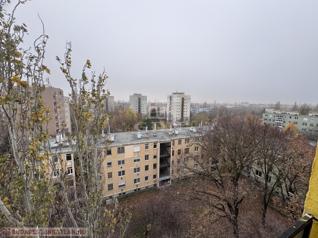 A lakás hetedik emeleti nyugalma felülről mutatja meg a város egyik legszebb arcát: fás, barátságos házak, a távolban a budai dombok – egy olyan panoráma, amitől minden nap jobb kedvvel indulsz el otthonról.
