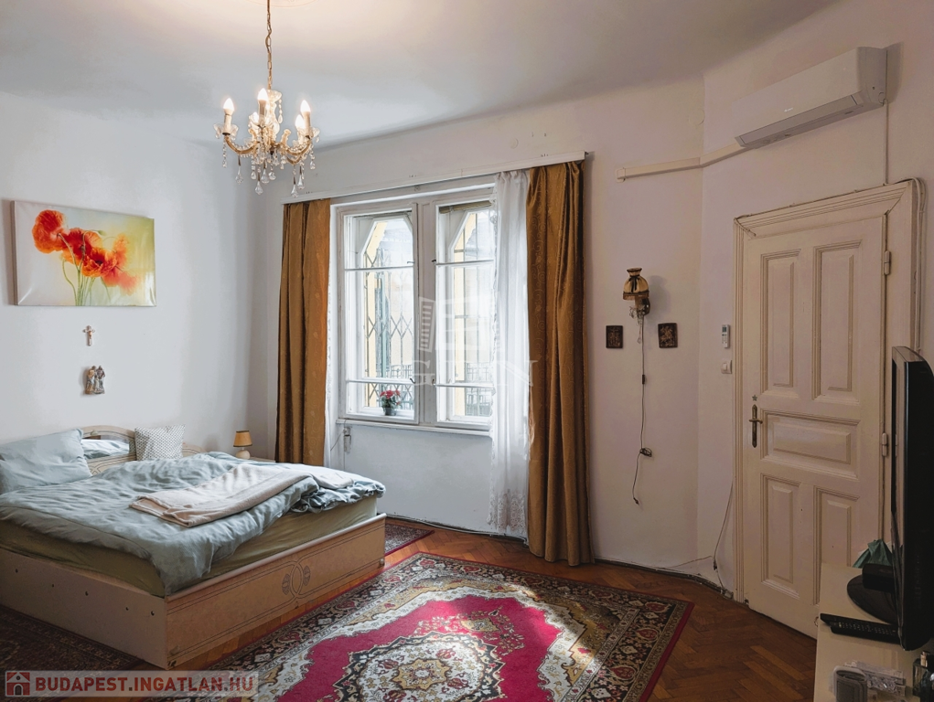 A hatalmas hálószoba a csendes belső udvarra néz, ideális pihenéshez.