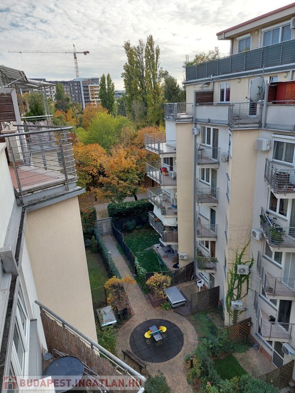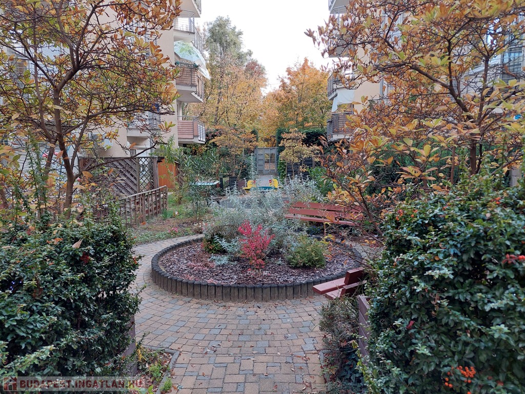 A lakás teljes hosszában futó nagy terasz igazi extra: grillezéshez, beszélgetésekhez és pihenéshez kiváló. A belső kertre néz, két napellenző gondoskodik a kellemes árnyékról.