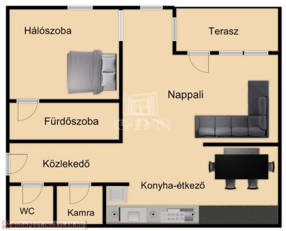 A tágas nappali-konyha-étkező mellett a lakásban egy kertre néző hálószoba és ahhoz kapcsolódó fürdőszoba épített zuhanyzóval, WC-vel, valamint a közlekedőből nyíló külön vendég mosdó és kamra található.