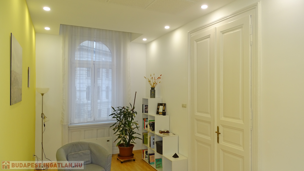 A villanyhálózat, a burkolatok, a nyílászárók cserélve lettek. Álmennyezetbe szerelt világítás van az ingatlanba, így az eredeti 3.60m belmagasság 3 m-re csökkent. Ezzel a megoldással sokkal esztétikusabb lett ( szerelés tekintetében mindenképpen hasznos) és a fűtés-hűtés esetén kevesebb teret szükséges temperálni, amellett hogy a térérzet teljesen megmaradt.
