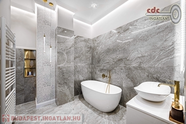 fő hálószobához egy elegáns káddal, WC-vel és bidével felszerelt fürdőszoba kapcsolódik, míg a második szobához egy modern zuhanyzós fürdő. Az ingatlan prémium minőségű bútorokkal és gépekkel együtt eladó, így az új tulajdonos azonnal beköltözhet egy teljesen felszerelt, exkluzív otthonba. A teljes körű felújítás során megtörtént a víz- és villanyvezetékek, valamint a fűtéscsövek, radiátorok cseréje. Designer csillárok, beépített szekrények, minőségi szaniterek és prémium burkolatok kerültek beszerelésre. A 3,30 méteres belmagasság és a chevron mintás tölgyfa parketta különleges, elegáns hangulatot kölcsönöz az otthonnak. A konyha teljesen gépesített, AEG márkájú készülékekkel felszerelt, mosogatógép, hűtő fagyasztóval, sütő, mikró, főzőlap, páraelszívó és mosógép is rendelkezésre áll. A lakás kényelmét két légkondicionáló és automata redőnyök, plusz sötétítők biztosítják. A fűtést házközponti rendszer biztosítja, a közös költség vízzel együtt 53.709.- Ft havonta. A társasház a klasszikus budapesti építészeti stílust képviseli. Az épület az 1900-as évek elején épült, és azóta számos felújításon esett át, megőrizve eredeti báját és eleganciáját. Az ingatlan, a lifttel felszerelt társasház 2. emeletén található a lépcsőházból nyílik a bejárati ajtó. A közvetlen közelben több busz- és villamosvonal elérhető, amelyek gyors és kényelmes kapcsolatot biztosítanak a város többi részével. Ez a lakás nem csak otthonként, hanem befektetésként is tökéletes választás azok számára, akik a belvárosi luxust és kényelmet keresik. Az ingatlan minden részlete a legmagasabb színvonalat