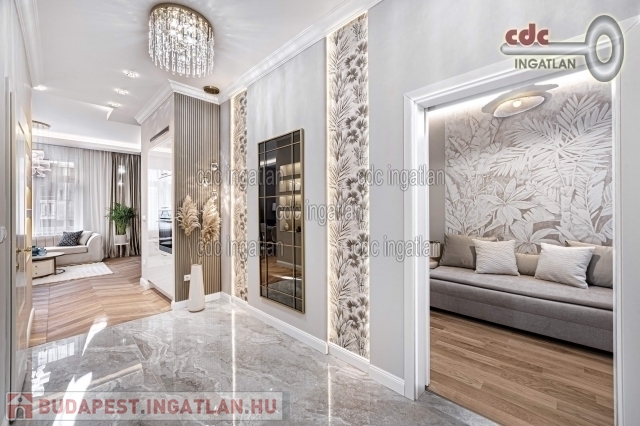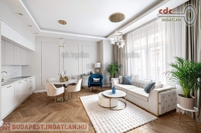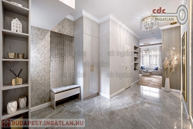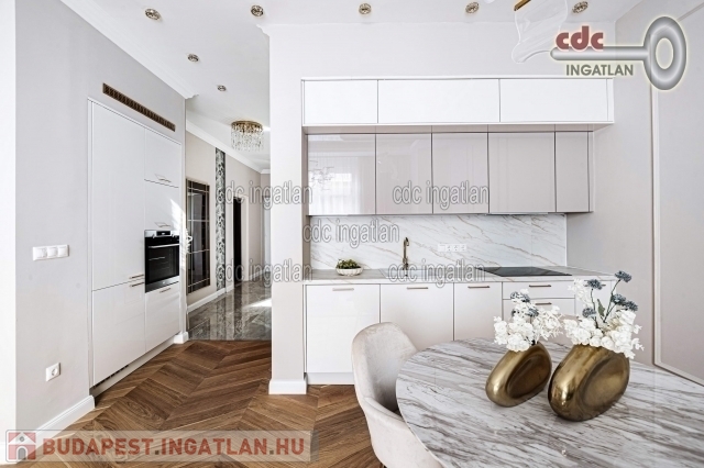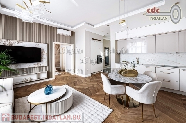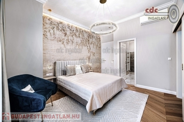 fő hálószobához egy elegáns káddal, WC-vel és bidével felszerelt fürdőszoba kapcsolódik, míg a második szobához egy modern zuhanyzós fürdő. Az ingatlan prémium minőségű bútorokkal és gépekkel együtt eladó, így az új tulajdonos azonnal beköltözhet egy teljesen felszerelt, exkluzív otthonba. A teljes körű felújítás során megtörtént a víz- és villanyvezetékek, valamint a fűtéscsövek, radiátorok cseréje. Designer csillárok, beépített szekrények, minőségi szaniterek és prémium burkolatok kerültek beszerelésre. A 3,30 méteres belmagasság és a chevron mintás tölgyfa parketta különleges, elegáns hangulatot kölcsönöz az otthonnak. A konyha teljesen gépesített, AEG márkájú készülékekkel felszerelt, mosogatógép, hűtő fagyasztóval, sütő, mikró, főzőlap, páraelszívó és mosógép is rendelkezésre áll. A lakás kényelmét két légkondicionáló és automata redőnyök, plusz sötétítők biztosítják. A fűtést házközponti rendszer biztosítja, a közös költség vízzel együtt 53.709.- Ft havonta. A társasház a klasszikus budapesti építészeti stílust képviseli. Az épület az 1900-as évek elején épült, és azóta számos felújításon esett át, megőrizve eredeti báját és eleganciáját. Az ingatlan, a lifttel felszerelt társasház 2. emeletén található a lépcsőházból nyílik a bejárati ajtó. A közvetlen közelben több busz- és villamosvonal elérhető, amelyek gyors és kényelmes kapcsolatot biztosítanak a város többi részével. Ez a lakás nem csak otthonként, hanem befektetésként is tökéletes választás azok számára, akik a belvárosi luxust és kényelmet keresik. Az ingatlan minden részlete a legmagasabb színvonalat