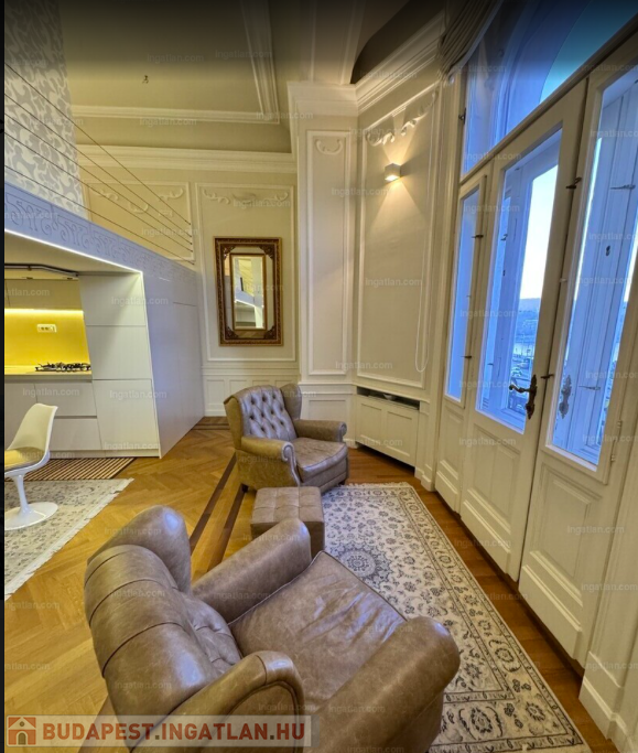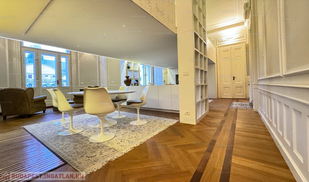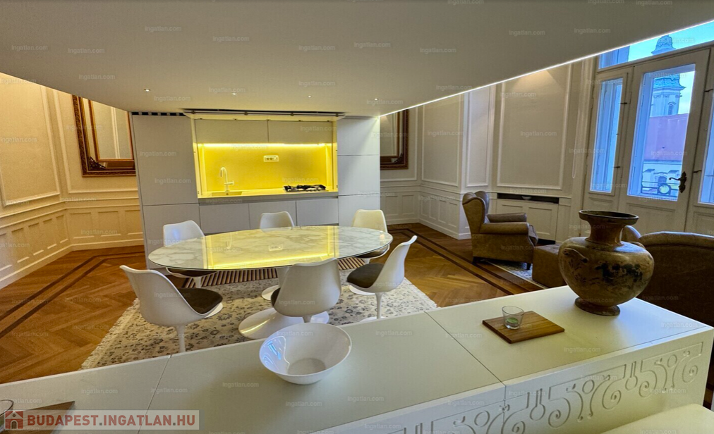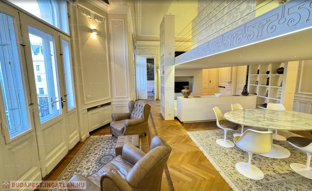 RITKASÁG! FULL DUNAI PANORÁMÁS KÜLÖNLEGES, LUXUS LAKÁS teljes berendezéssel, galériával( háló+dolgozó), 2 fürdővel, klímával, elektromos redőnyökkel, excluzív gépesített konyhával, Dunára , Erzsébet hídra és a Budai hegyekre full panorámás, erkélyes, církó fűtéses lakás, elképesztően gyönyörű szecessziós épületben. Az ingatlan kiválóan alkalmas ritkasága és értékállósága, továbbá adottságai miatt befektetésnek, akár lakásnak, akár egy reprezentatív irodának.Váci utca, M3 metro Duna Corso 2 perc séta távolságnyira.