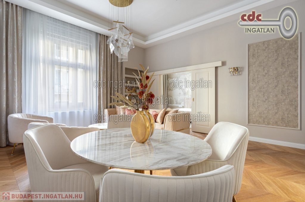 Belvárosi elegáns, exkluzív luxuslakás eladó! V. kerületben, a Nyáry Pál utcában, a Váci utca szomszédságában, III. emeleti, 89 m2-es nappali + 2 hálószobás, duplakomfortos, vendég wc-s, luxuslakás eladó. Az ingatlan prémium minőségű felújításon esett át, melynek során a legkiválóbb minőségű anyagokat használták fel, a lakás minden részletében az eleganciát tükrözi. Az ingatlan amerikai konyhás nappalival rendelkezik, a fő hálószoba és a nappali a csendes Nyáry Pál utcára néz, míg a második hálószoba a nyugodt belső udvarra nyílik. Mindkét hálószobához külön fürdőszoba tartozik, a fő hálószobához egy elegáns káddal, WC-vel és bidével felszerelt fürdő kapcsolódik, míg a második hálószobához egy modern zuhanyzós. A lakásban külön vendég WC is található. Az ingatlan prémium minőségű bútorokkal és gépekkel együtt eladó, így az új tulajdonos azonnal beköltözhet egy teljesen felszerelt, exkluzív otthonba. A teljes körű felújítás során új nyílászárók lettek beépítve, valamint minden víz- és villanyvezetékek cserélve lett. Designer csillárok, beépített szekrények, minőségi szaniterek és prémium burkolatok kerültek beépítésre. A 3,6 méteres belmagasság és a chevron tölgyfa parketta különleges, elegáns hangulatot kölcsönöz az otthonnak. A konyha teljesen gépesített, AEG márkájú készülékekkel felszerelt: mosogatógép, hűtő fagyasztóval, sütő, főzőlap, páraelszívó és mosó- szárítógép is rendelkezésre áll. Az ingatlan kényelmét három légkondicionáló és automata redőnyök biztosítják. A fűtés és a melegvíz kondenzációs kazánról üzemel, a közös költség vízdíjat és célbefizetést tartalmaz, melynek összege 42.809.-Ft havonta. Ez a lakás nem csak otthonként, hanem befektetésként is tökéletes választás azok számára, akik a belvárosi luxust és kényelmet keresik. Az ingatlan minden részlete a legmagasabb színvonalat képviseli, így garantáltan megfelel a legigényesebb vásárlók elvárásainak is.