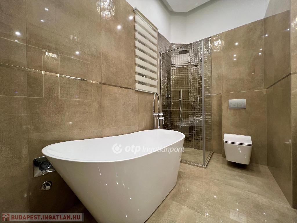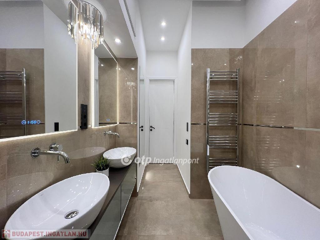 A fürdőben zuhanykabin és kád is el lett helyezve, okostükrök, márvány burkolat.