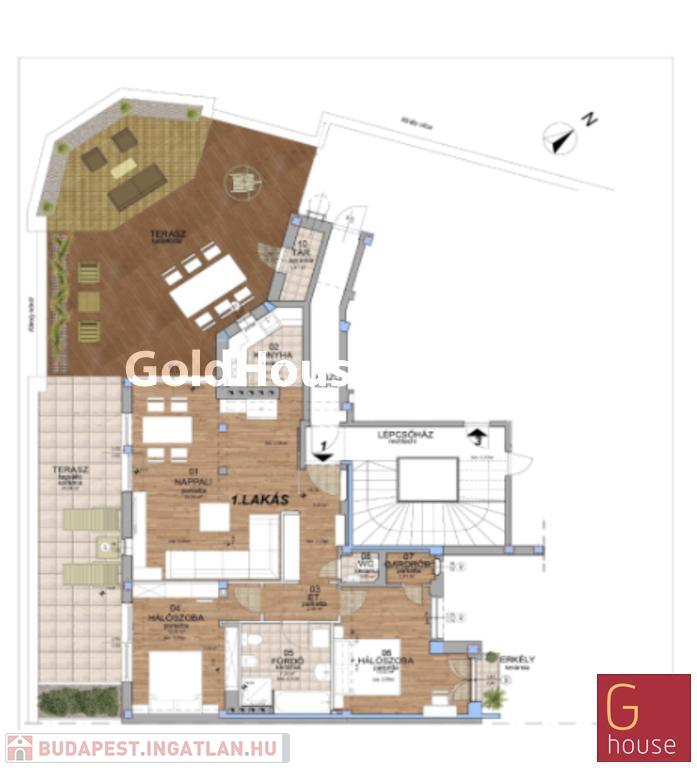 A lakás a tetőtérben helyezkedik el, zárható rácsos kapuval elválasztva a többi emelttől, így nagyon csendes és privát.