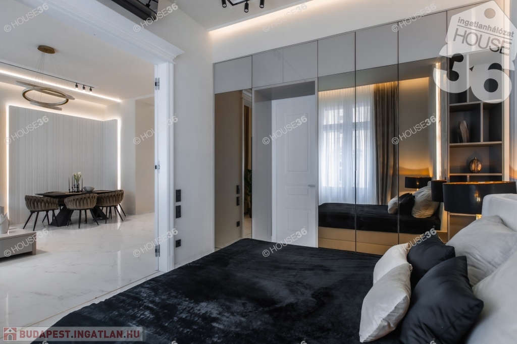 Budapest egyik legismertebb sétáló utcájában található ez a rendkívül kifinomult 3,7 méter belmagasságú luxus lakás.