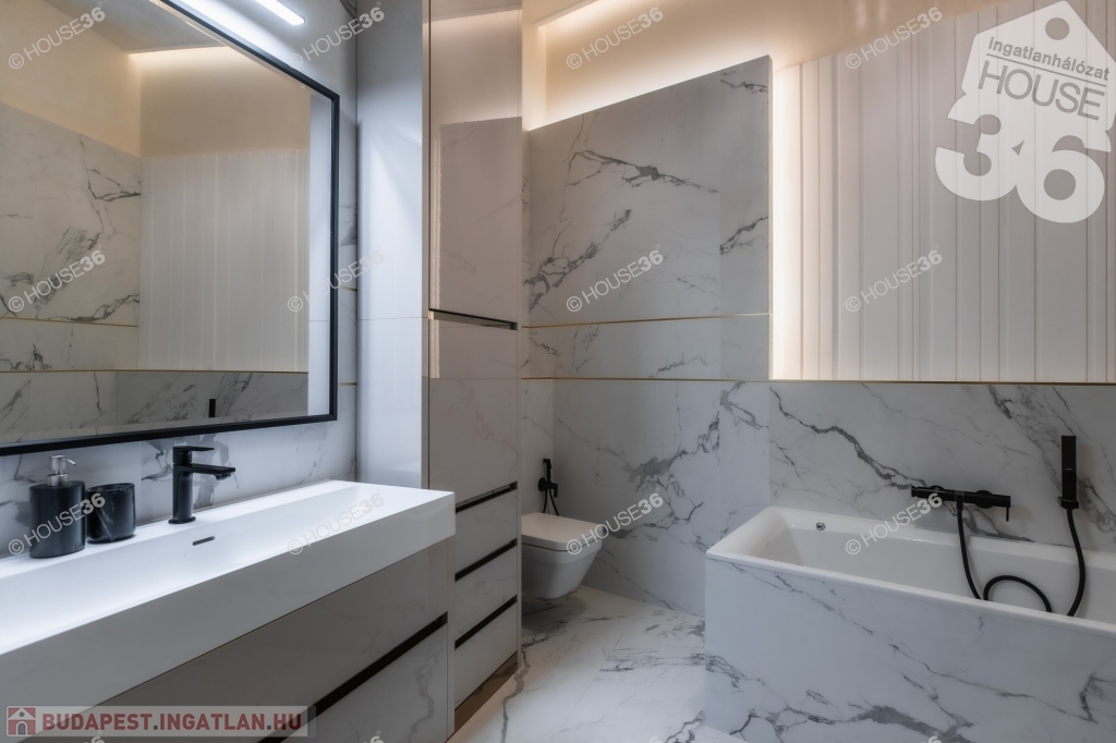 Neves tervezőiroda által megálmodott és egyedileg kivitelezett értékálló polgári lakás. Egyedileg tervezett bútorok, minőségi hidegburkolatok, led fény világítások mellett különleges Onyx kőből épitett bárpult is található.