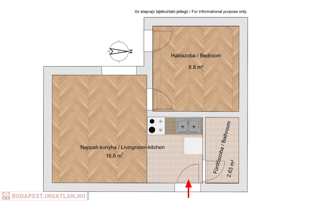 Előszoba + konyha-nappali kerámia burkolattal és laminált parkettával