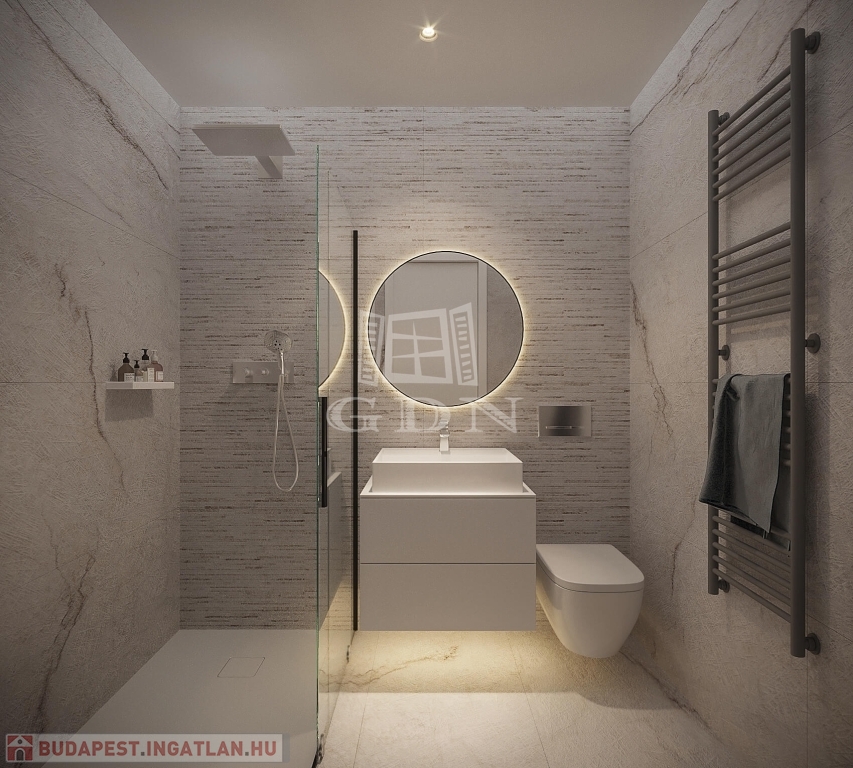A lakás hőellátását és hűtését teljesen megújuló energiaforrással, a külső levegő hőenergiájának felhasználásával terveztük, amelyet osztott „Split” rendszerű hőszivattyúval hasznosítunk hűtési, fűtési és használati melegvíz termelés célra. A hőszivattyúk elektromos ellátása GEO tarifás áram vételezéssel történik. Ezenkívül a lakás magas színvonalú Smart Home rendszerrel van felszerelve.