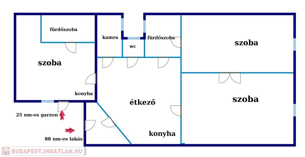 Az ingatlan 113 nm-es amely jelenleg 2 bejárattal rendelkezik, de a két lakás között az átjárás jelenleg is biztosított.