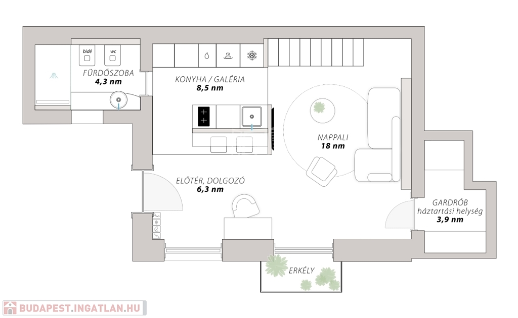 Az 1. emeleti, 41 m²-es lakás praktikus elrendezésű, amelyhez 8 m²-es galéria és egy 2 m²-es terasz is tartozik. Az ablakok és a terasz a gondosan megújított belső udvarra néznek, így a belvárosi elhelyezkedés ellenére csendes, nyugodt életteret biztosítanak.
