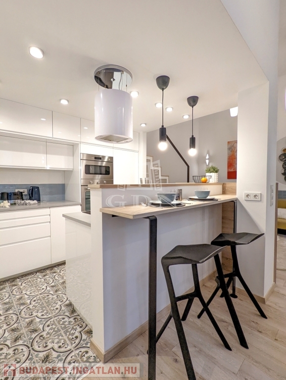 A lakás teljes körűen, lakberendező közreműködésével került kialakításra, prémium minőségben. A nagy belmagasság lehetővé tette egy kényelmes hálógaléria kialakítását. A műszaki felszereltség magas színvonalú: egyedileg szabályozható elektromos fűtés, klímaberendezés, modern fürdőszoba zuhanyzóval, WC-vel és bidével, külön háztartási helyiség gardróbbal, mosó- és szárítógéppel. A konyha teljesen gépesített, sütővel, indukciós főzőlappal, mosogatógéppel, hűtővel és borhűtővel.