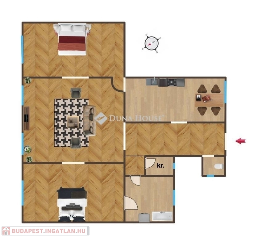 A lakásba belépve balra a külön nyíló mellékhelyiségeket találjuk, mindegyik szellőzése megoldott, a lichthófra nyíló ablakokkal. Jobbra világos, udvari nézetű, étkezős konyhába érkezünk. Igény szerint némi átalakítással egy plusz hálószoba kialakítása is lehetséges itt és a nappaliba áthelyezve a konyhát, 3 külön nyíló hálószobát kaphatunk. A lakásban a fűtést gáz cirkó biztosítja, mely modern és hatékony megoldás a téli hónapokban.