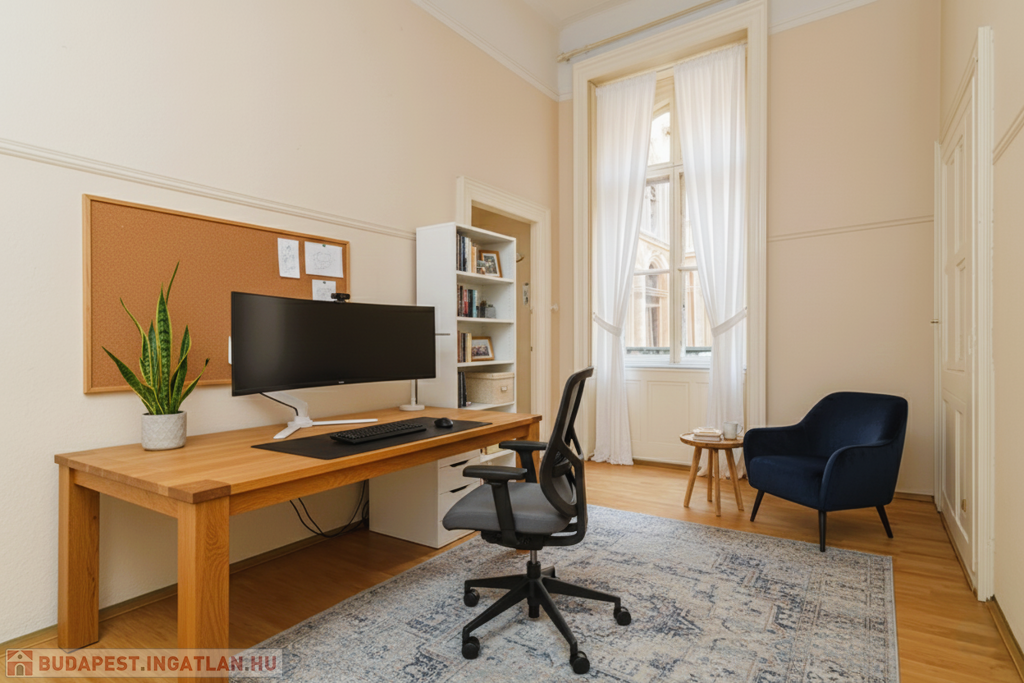 Az ingatlan csendes udvarra néz, két külön bejárattal rendelkezik, így akár irodának is ideális.