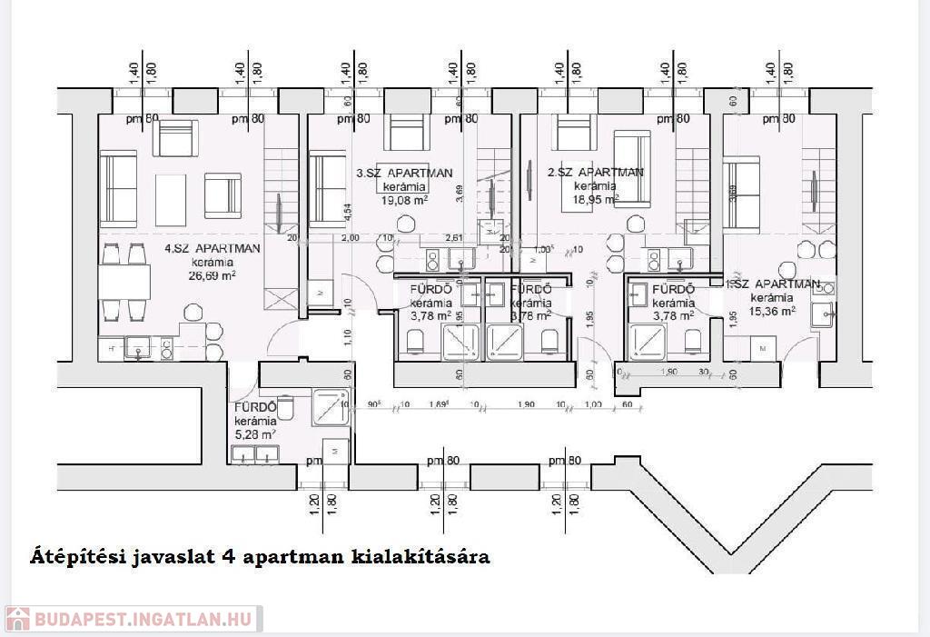 Budapesten a VI. kerületben a Bajcsy Zsilinszky úton eladó egy 121 nm-es 4 szobás lakás, ami adottságaiból adódóan jól átalakítható egy 4 lakásos apartmanná, ahol minden lakrész külön nyílik, van külön fürdő és kis teakonyha a lakásokhoz (lásd átépítési alaprajz).