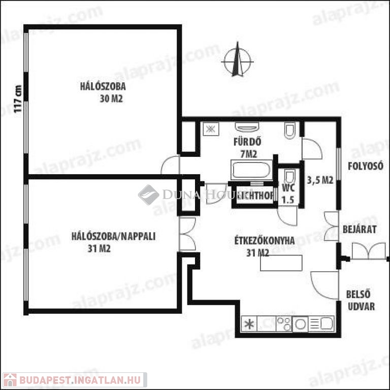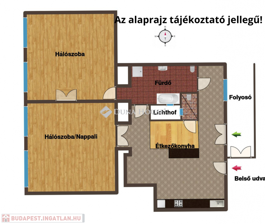 A lakásba lépve tágas konyha és étkező fogad, ahonnan egy hangulatos, növényekkel teli belső udvarra is kiléphetünk.