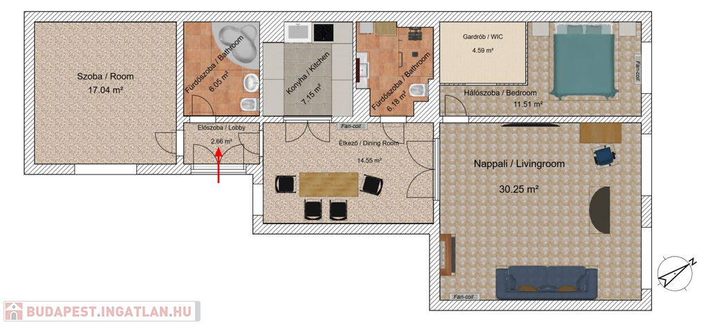 - Fűtés: fan-coil légfűtés, klímával kombinálva