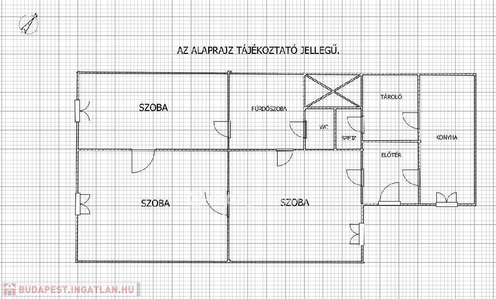 A lakásban három nagy szobából kettő az ucára, egy az udvarra néz. A fürdőszobája is méretes, kád és tusoló is található benne. A WC külön bejáratú. Jól felszerelt konyhája egyben van az étkezővel. A konyhából egy nagy kamra nyílik, amiből még egy kis spejzba jutunk. A fűtést gáz-cirkó kazán biztosítja. Négyméteres belmagassága miatt kiválóan galériázható.