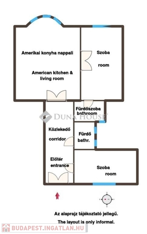 A lakás elosztása: tágas amerikai konyha -étkező- nappali, mindkét hálószobához tágas fürdőszobákkal.