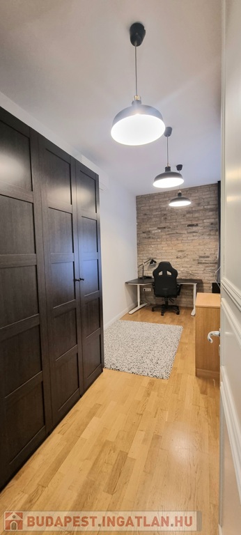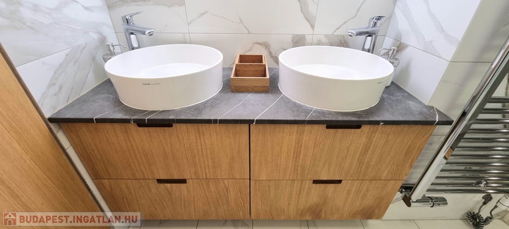 A lakás minden helyiségében igényes asztalosmunkának lehetünk tanúi, ezt mutatja többek között a megvilágított tálalószekrény és az igény esetén bővíthető hatalmas konyhasziget/étkezőasztal is.