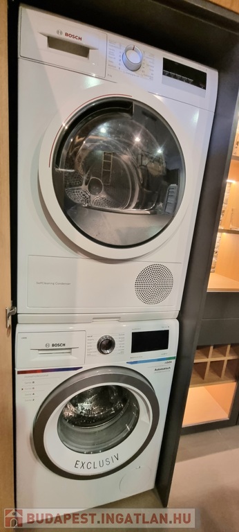 A lakásba belépve a tágas étkezőkonyhában találjuk magunkat, ami magas minőségű, beépített Bosch gépekkel (mosó- és szárítógép, mosogatógép, hűtőszekrény fagyasztóval, főzőlap, sütő és páraelszívó) felszerelt.