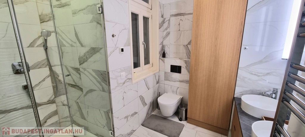 A fürdőszobában az épített zuhanyban egy elektromosan nyíló ablak is szolgálja a kényelmet (a nagyobb ablak mellett).