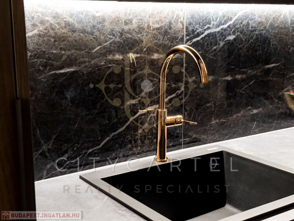 A lakás egyik különlegessége a tágas konyha, ahol konyhasziget kapott helyet, benne beépített borhűtővel, ami igazi kényelmi pluszt nyújt a mindennapokban. Emellett található egy külön kis háztartási helyiség, ahol a mosógép és a szárítógép került elhelyezésre – praktikus, zajtól elszeparált megoldás.