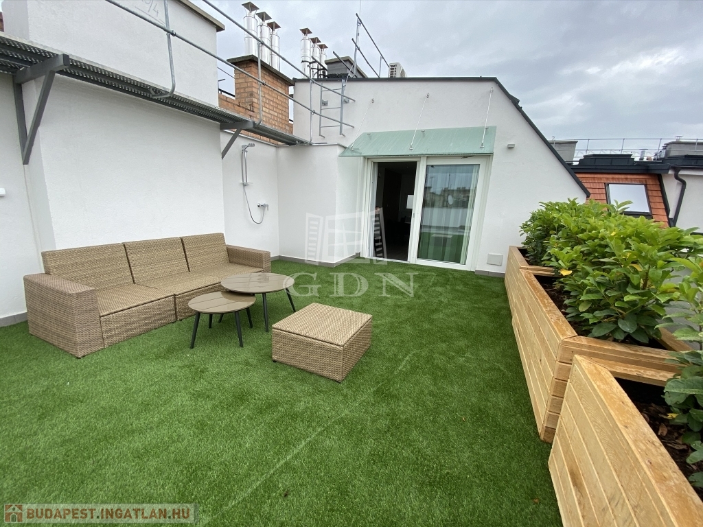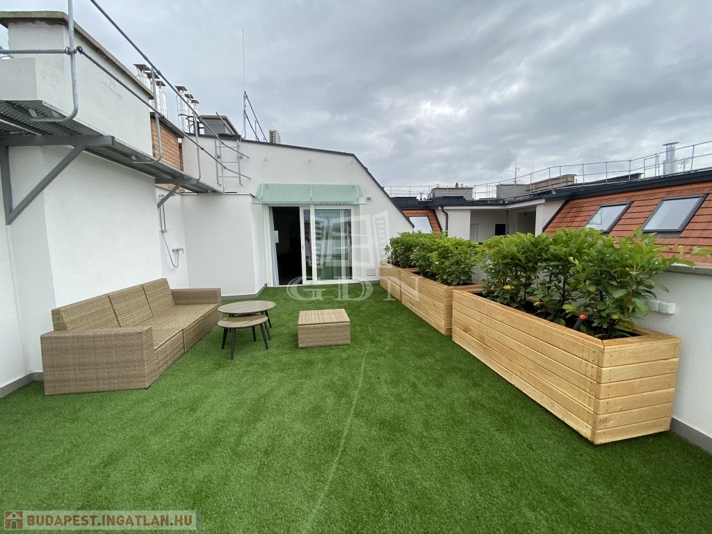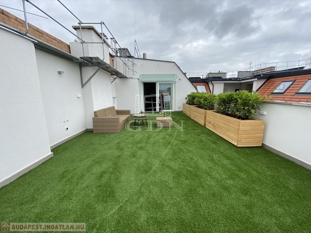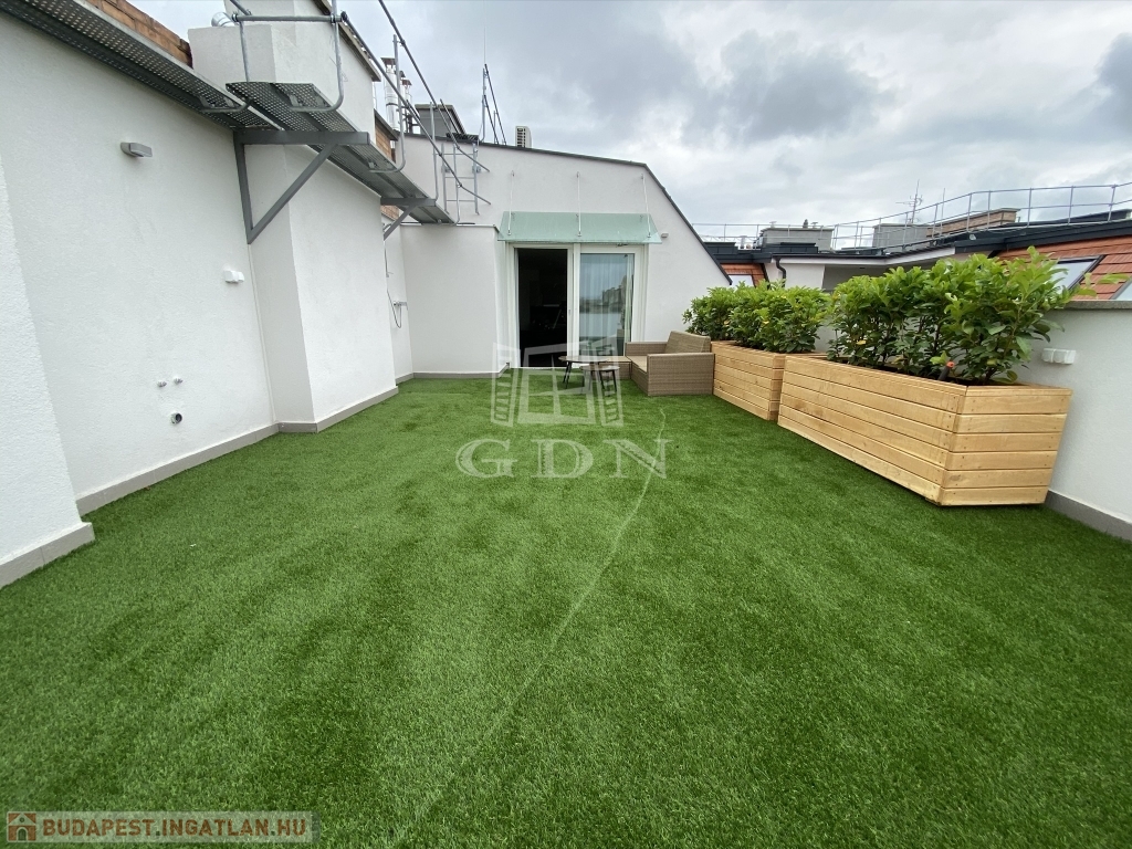 Nagymező utca közelében ajánljuk figyelmébe ezt az új építésű dupla komfortos, két hálószobás, nagy teraszos lakást. Az épület a beépítéssel párhuzamosan teljesen megújult, a lakás az ötödik emeleten található , a két hálószoba mellett két fürdőszoba került kialakításra. A lakás különlegessége a nappaliból nyíló 66m2-es terasz mely tavasztó őszig egy plusz szobát jelent. A lakás fűtése padlófűtés és gázkazán kombinációval lett megoldva mely a melegvizet is biztosítja.A hűtés split klímákkal megoldott, a konyha gépesített. A lakás jelenleg hosszú távra van bérbe adva 4,6% fizet évente a bérlő. Az elhelyezkedésének köszönhetően akár vagy rövidtávú bérbeadásra is tökéletes lehet.