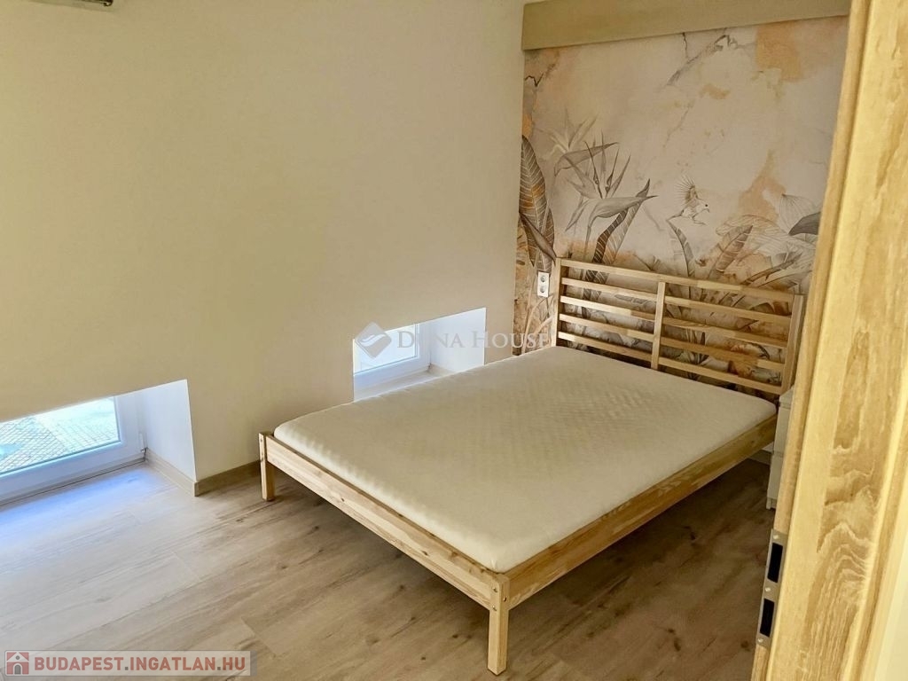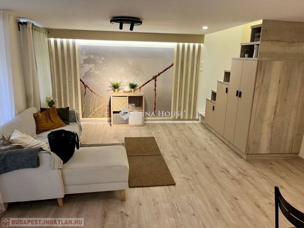 A Szondi utcában eladó egy belső, kétszintes, két hálószobás lakás, amely papíron 33 m², de a valóságban 66 m²-es.
