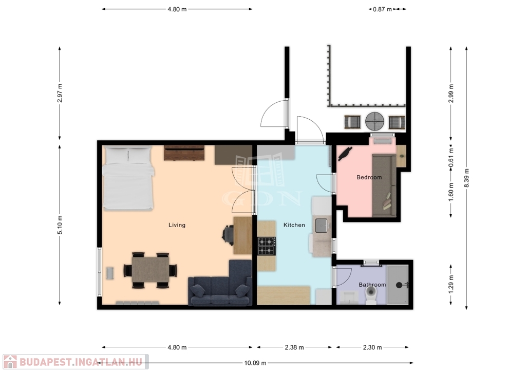 Az ingatlan 44 négyzetméteres, ideális választás egyedülállóknak vagy fiatal pároknak.
