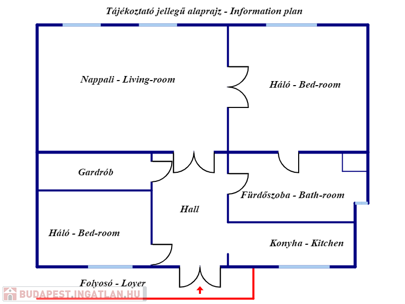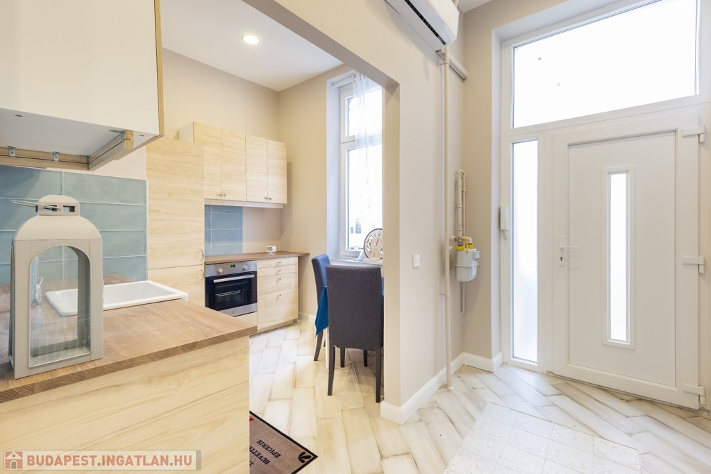 Jelenlegi kialakítás szerint, egy kis-szobányi gardrób áll rendelkezésre, vendégszobával, berendezett, igényes konyhával. A nagy ablakos fürdő szintén teljesen felújított, fa hatású csempével, és igényes zuhannyal van ellátva.