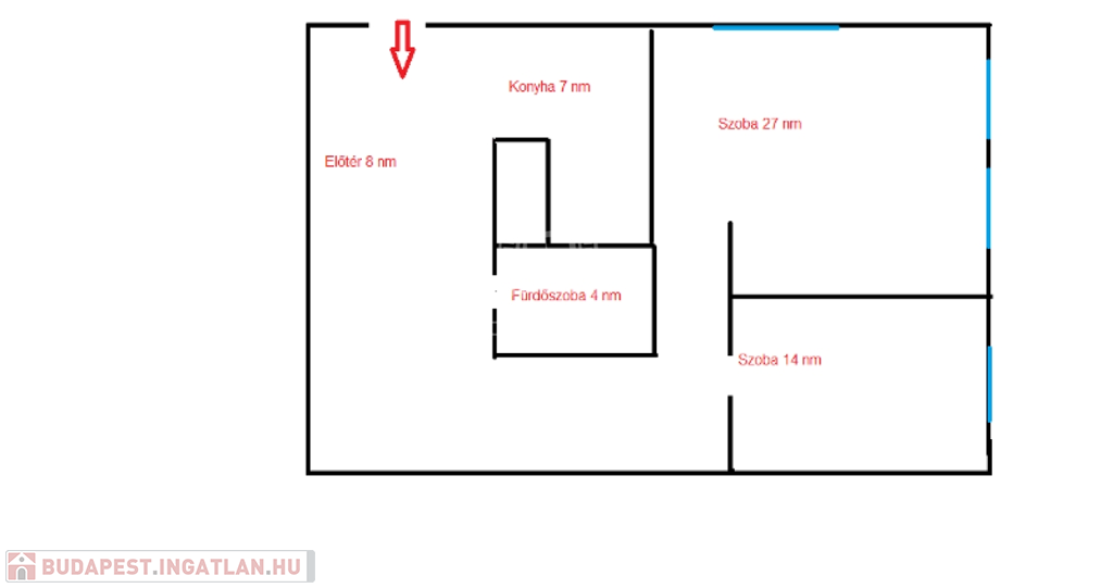 A 14 nm-es hálószobába az előszoba ajtóval szemből lépünk , a 27 nm-es nappali szobába egy kisebb közlekedő folyosó vezet.