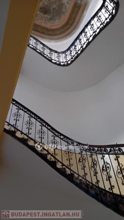 Gyönyörű, freskóval díszített lépcsőházban az első emeleten helyezkedik el a lakás, két bejárati ajtóval rendelkezik, amelyekből az egyik a lépcsőházból, a másik a körfolyosóról nyílik. 4,1 méteres belmagassága, hatalmas három méteres fa ajtajai tágas teret biztosítanak. A belmagasság miatt praktikusan galériázható.