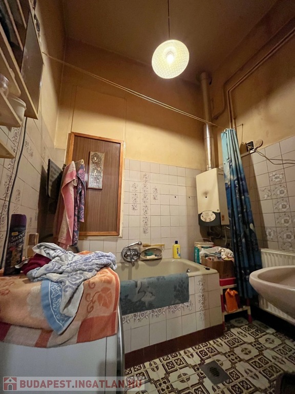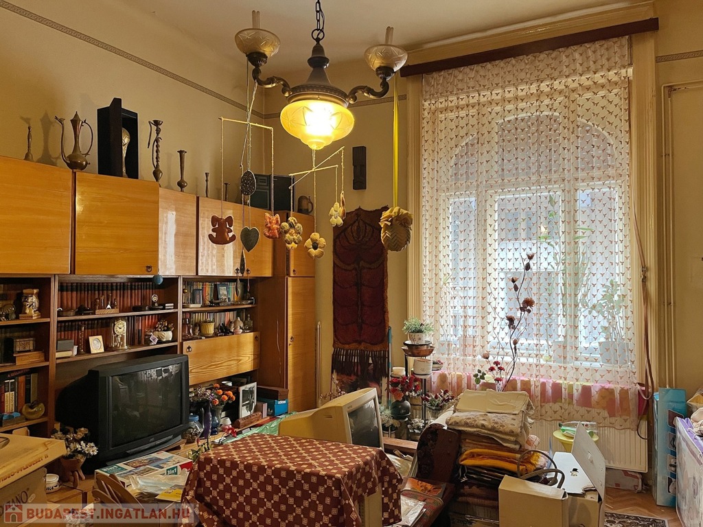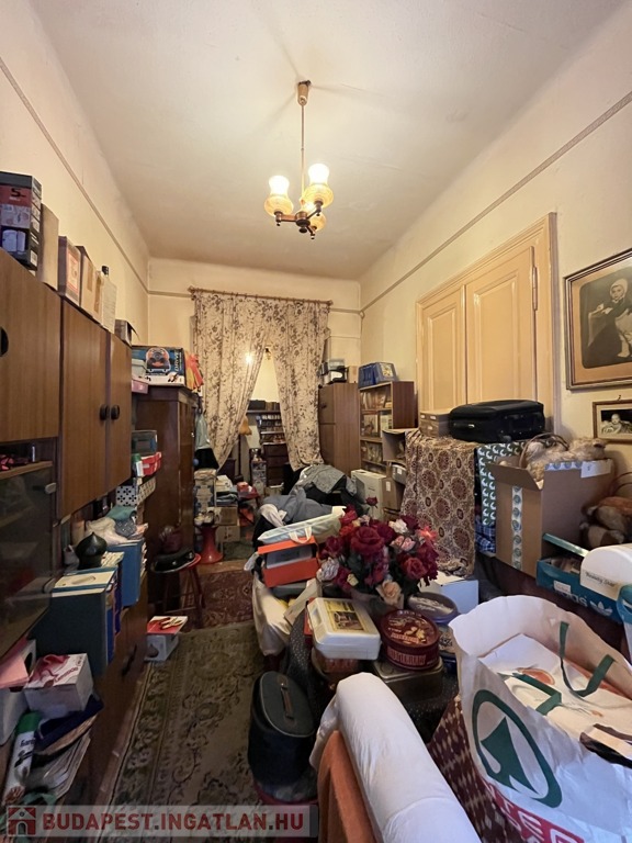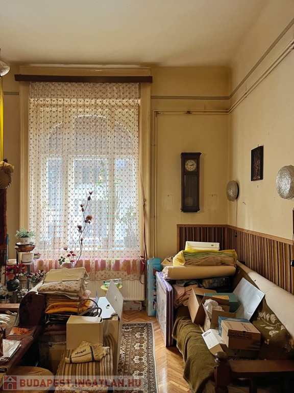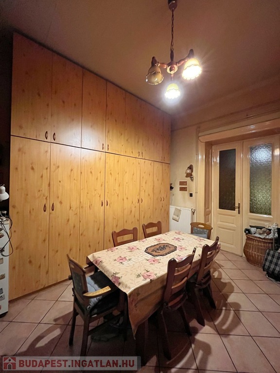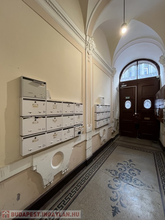 A lakás teljes körű felújítást igényel, az elosztása rendkívül praktikus: két bejárattal rendelkezik, az egyik a konyha melletti galériázott cselédszobából nyílik. A bejáratból tágas előtérbe lépünk, ahonnan az étkező és beépített, falig érő szekrénysor fogad. Innen egyenesen a nagyobbik szobába jutunk, majd egy átjárón keresztül elérjük a másik szobát is, ahonnan visszakanyarodhatunk az étkezőbe.